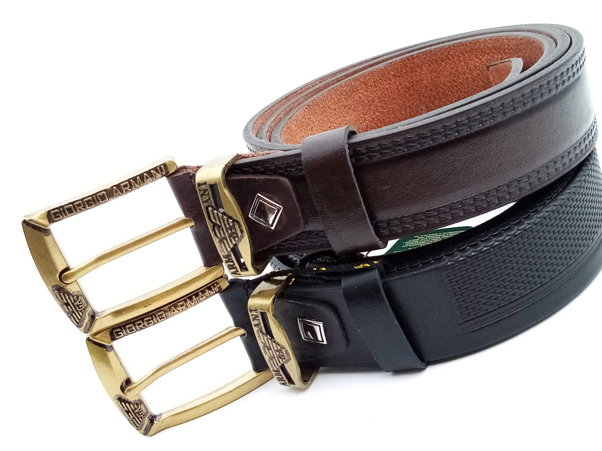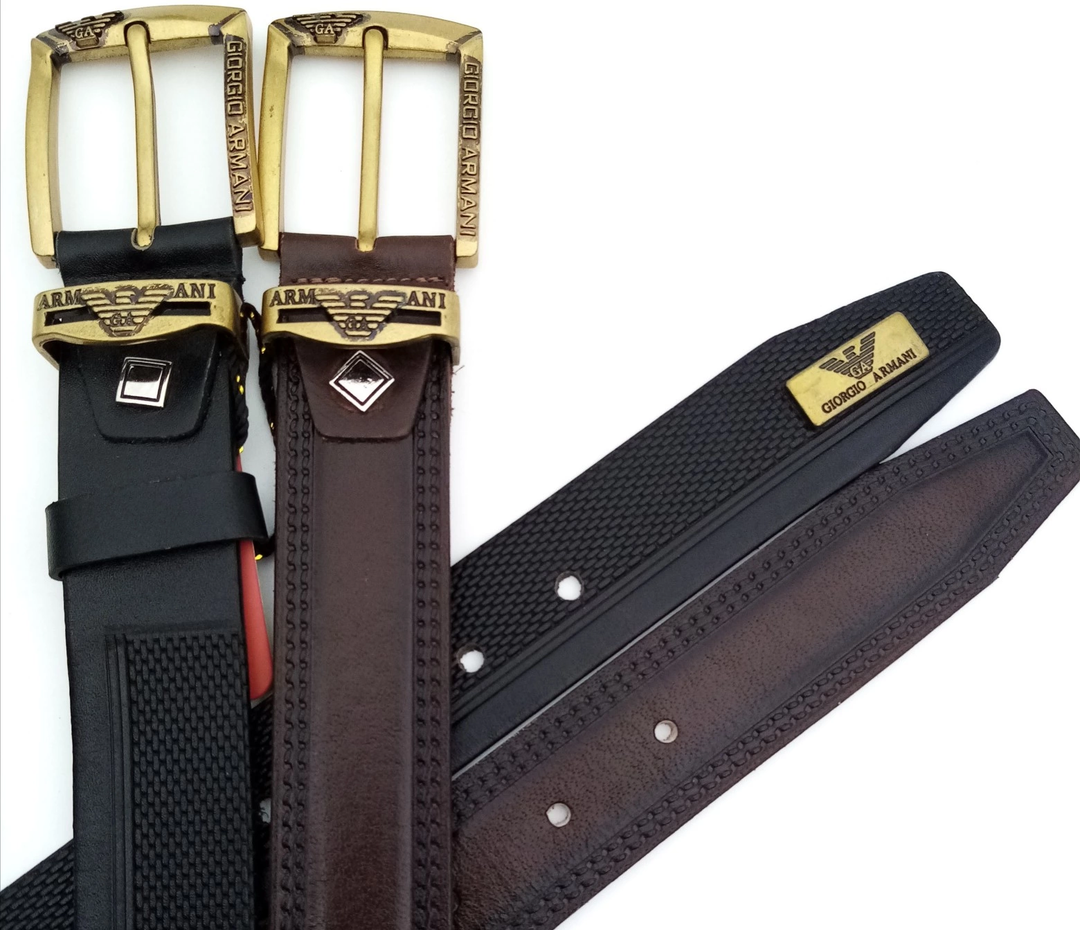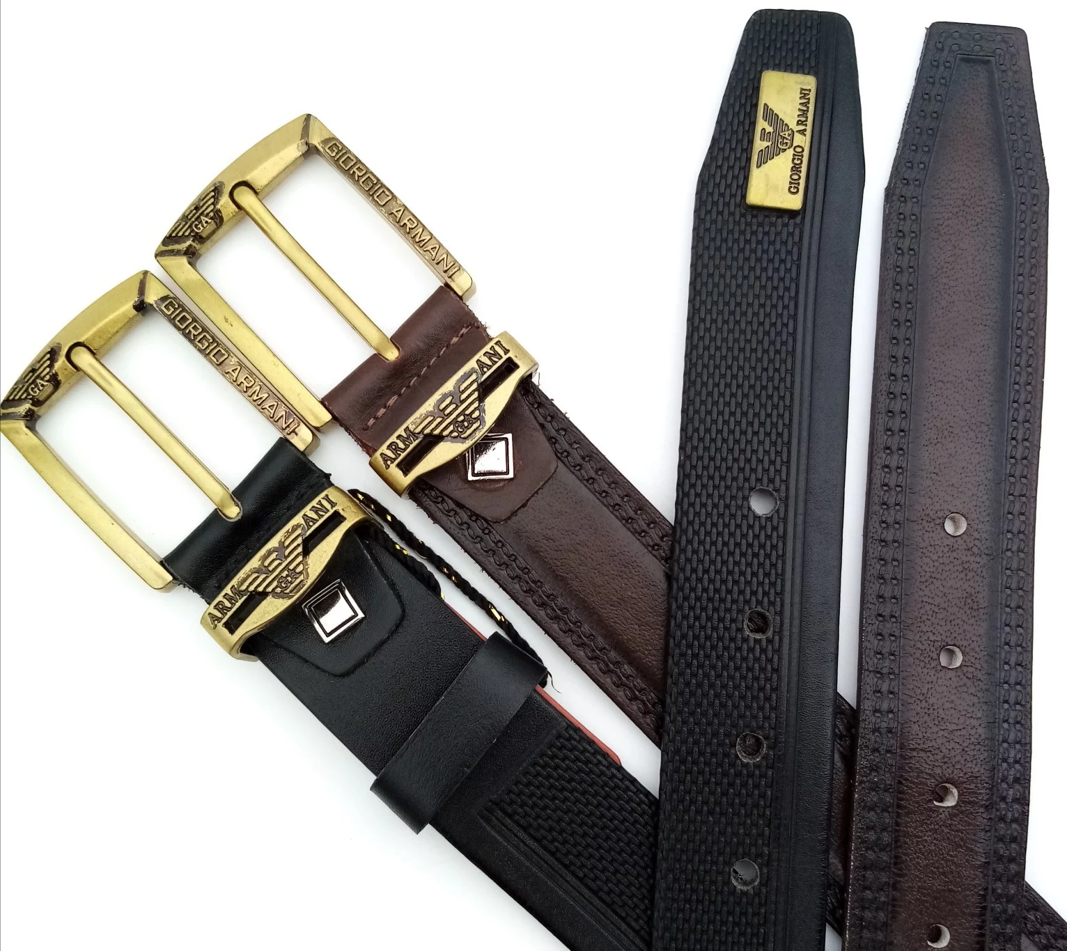 کمربند چرم خالص برند آرمانی در دو رنگ مشکی و قهوه ای با قلاب یا سگک زبانه دار به رنگ زردقلم(طلایی زردقلم) موجود می باشد