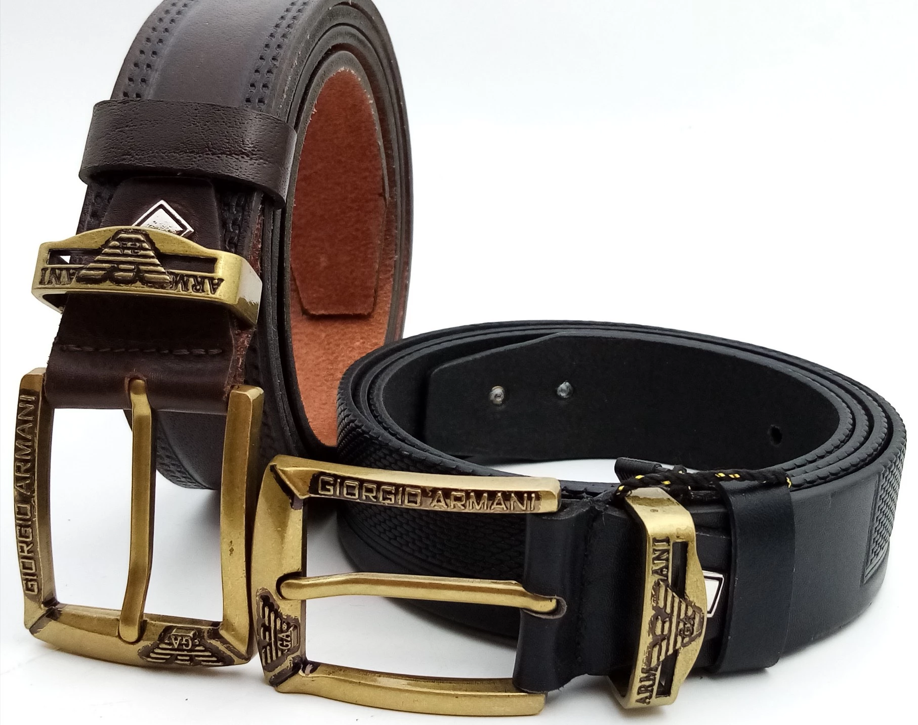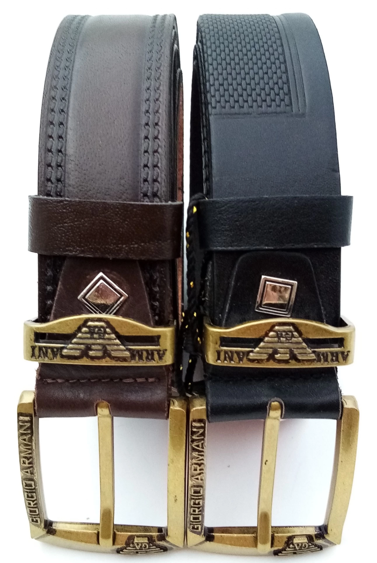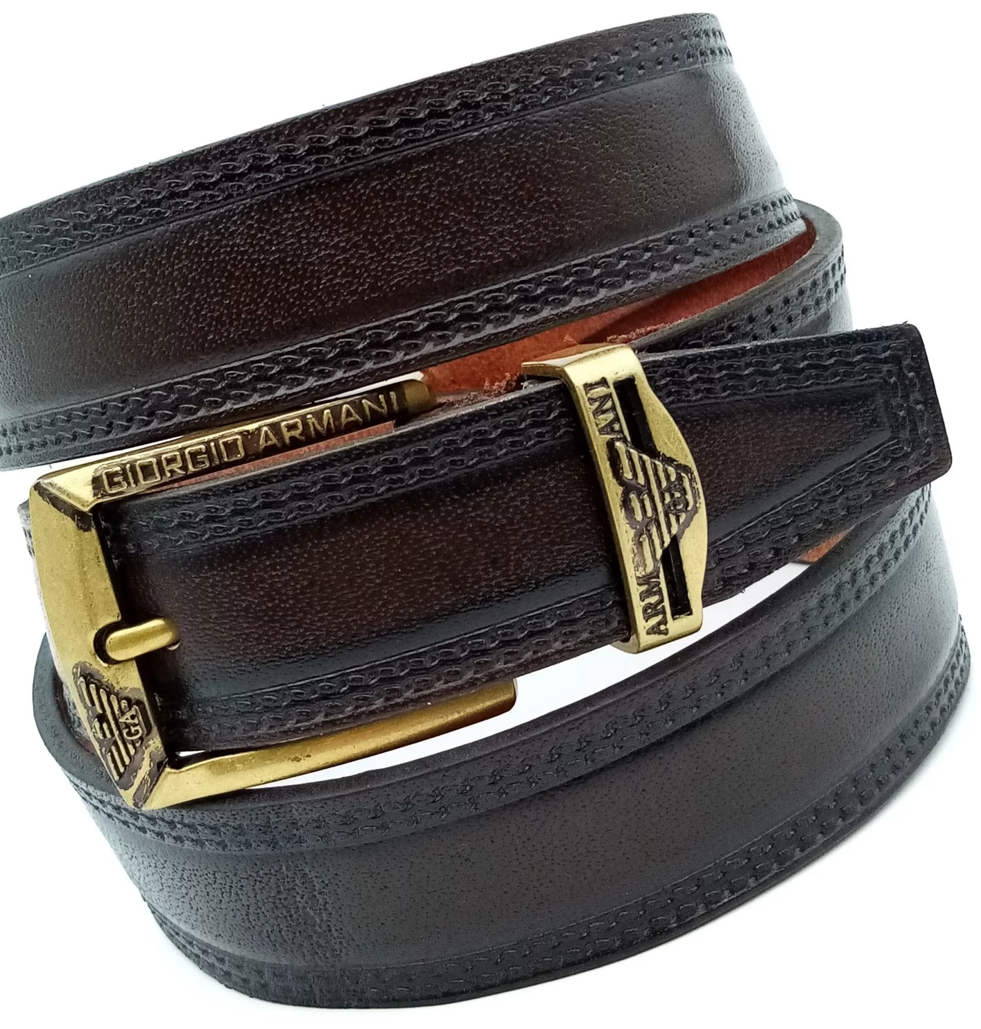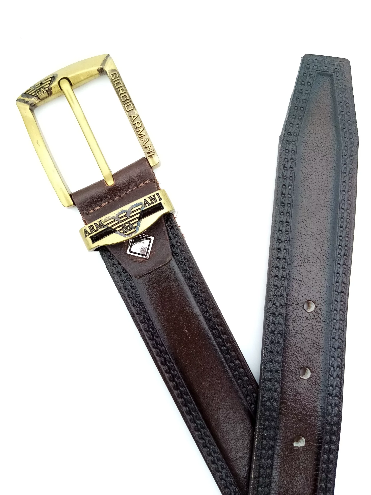 کمربند چرم خالص برند آرمانی در دو رنگ مشکی و قهوه ای با قلاب یا سگک زبانه دار به رنگ زردقلم(طلایی زردقلم) موجود می باشد